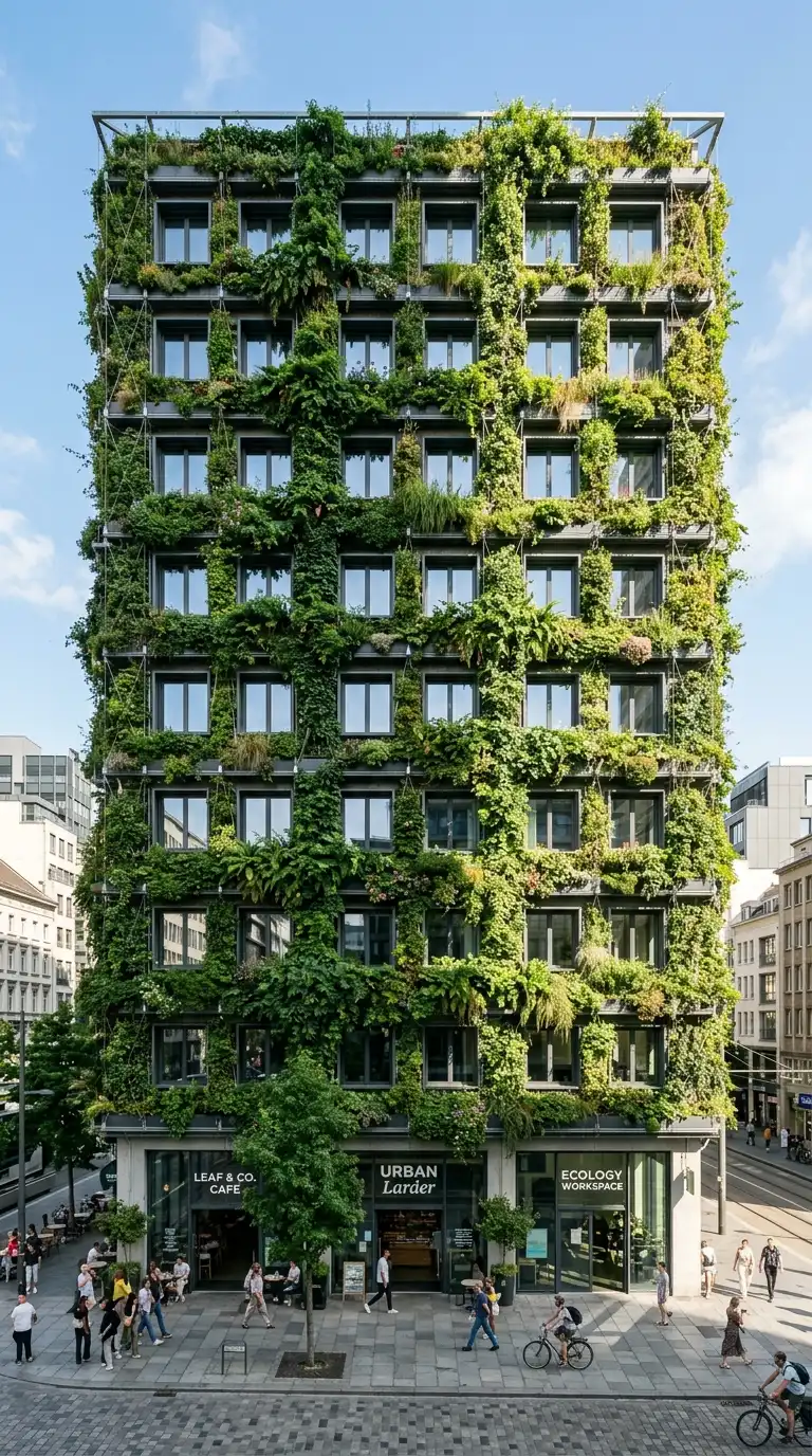 Green facades can be ground-grown (plants rooted in the ground, climbing the building) or wall-grown (plants rooted in containers on each floor). The emotional effect is living, breathing, and ecologically responsible.