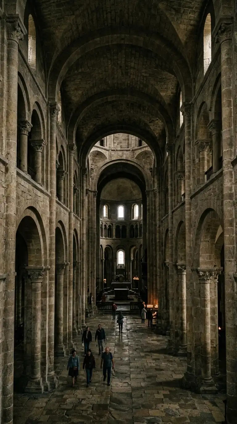 The Romanesque pilgrimage church is a large stone church built along the pilgrimage routes to Santiago de Compostela. The plan has a nave, side aisles, a transept, an ambulatory, and radiating chapels. The vault is a stone barrel vault. The church is dark, solid, and fortress-like.