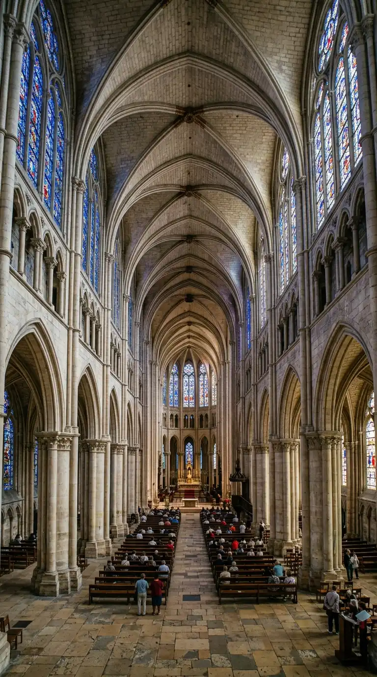 The Gothic cathedral is the most famous French building type. The nave is tall with pointed arches and ribbed vaults. Flying buttresses support the upper walls. The walls are filled with stained glass. The Gothic cathedral is vertical, luminous, and awe-inspiring.