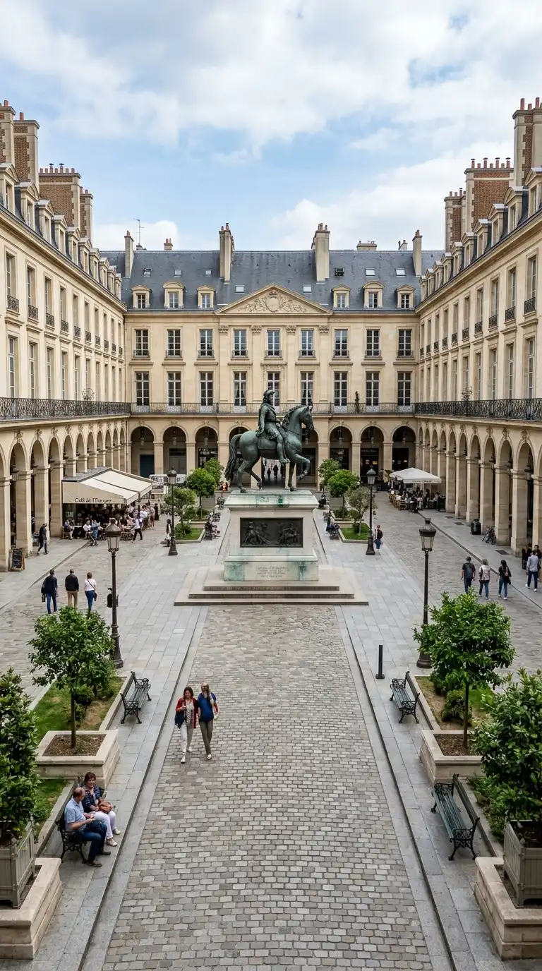 The place royale is a royal square in a French city. The square is surrounded by uniform townhouses. The centre has an equestrian statue of the king. The place royale is symmetrical, uniform, and urban.