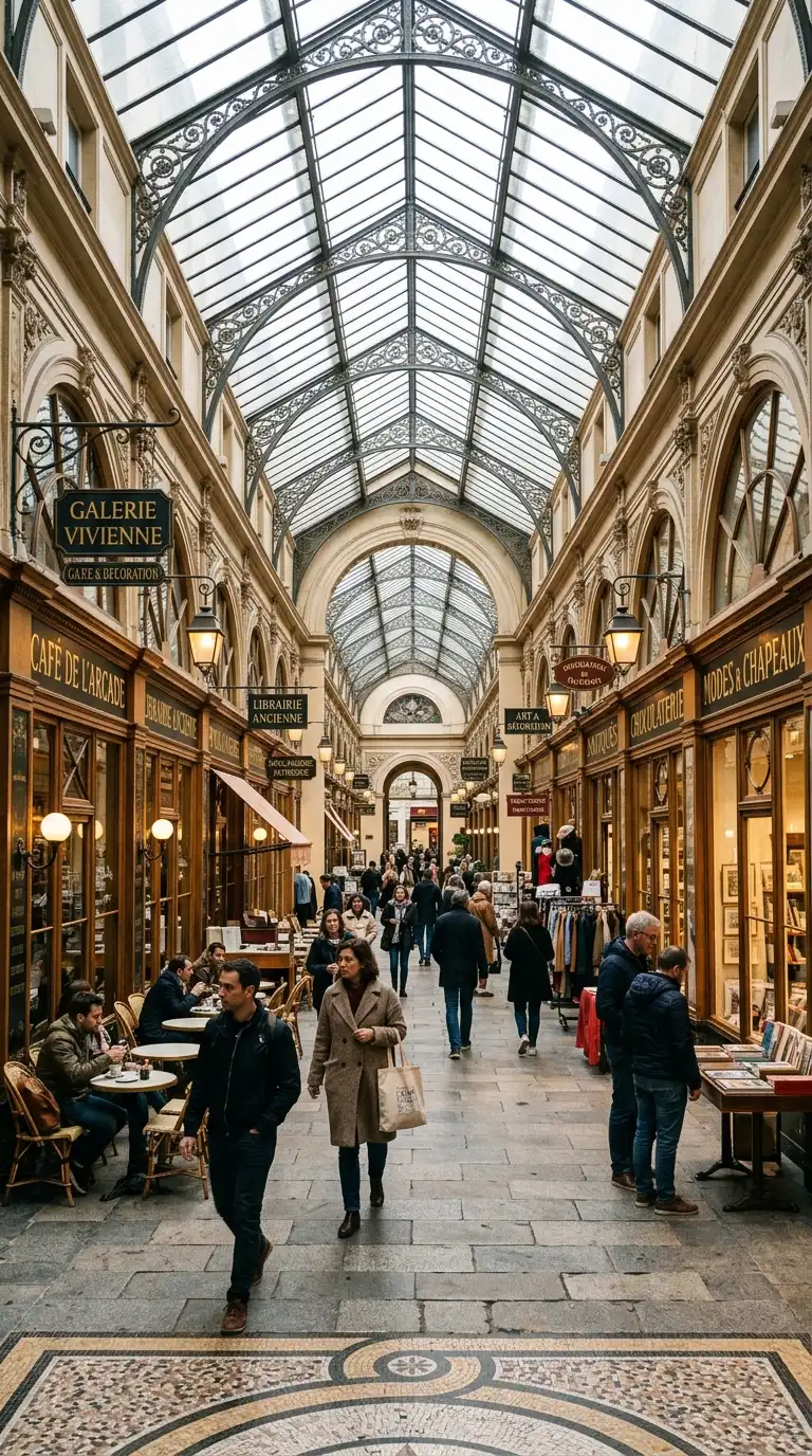 The Parisian arcade is a covered shopping street with glass roofs. The arcade is lined with shops, cafes, and bookstores. The arcade is a 19th-century invention. The Parisian arcade is covered, glass-roofed, and commercial.