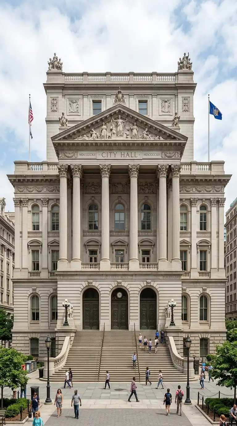 The Beaux-Arts building is a grand civic building from the late 19th century. The facade is symmetrical, with a raised basement, a grand staircase, a columned portico, and an attic storey. The Beaux-Arts building is monumental, hierarchical, and classical.