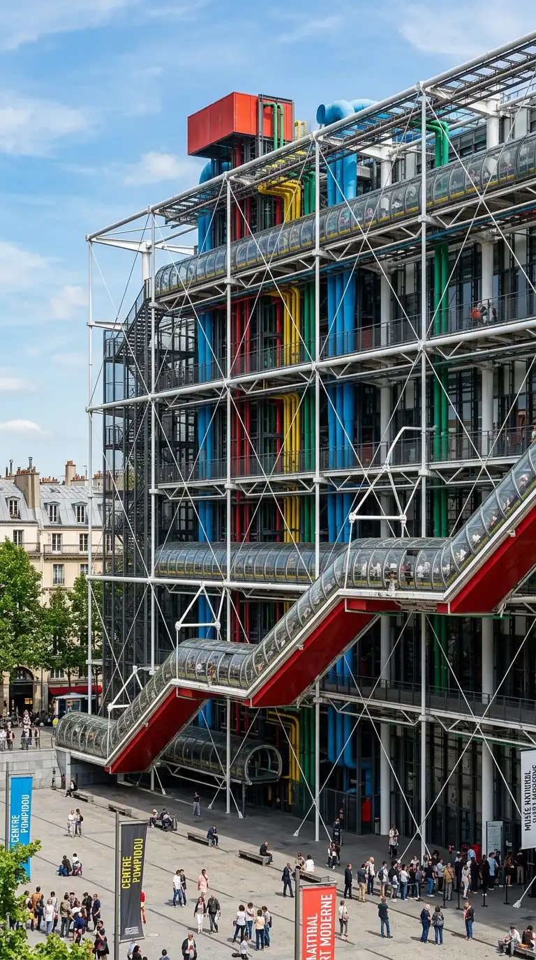 The contemporary French museum is a modern building for art. The most famous is the Centre Pompidou (1977) by Renzo Piano and Richard Rogers. The building has exposed structure and services on the exterior. The escalators are in glass tubes. The Centre Pompidou is high-tech, colourful, and inside-out.