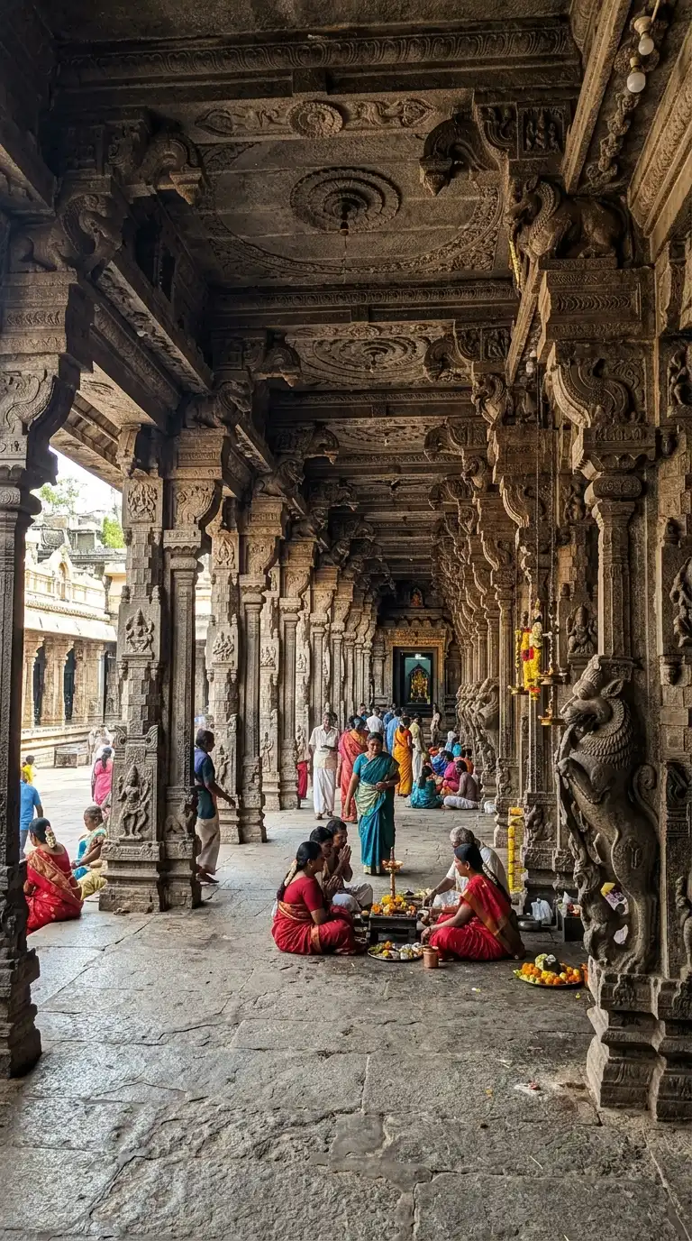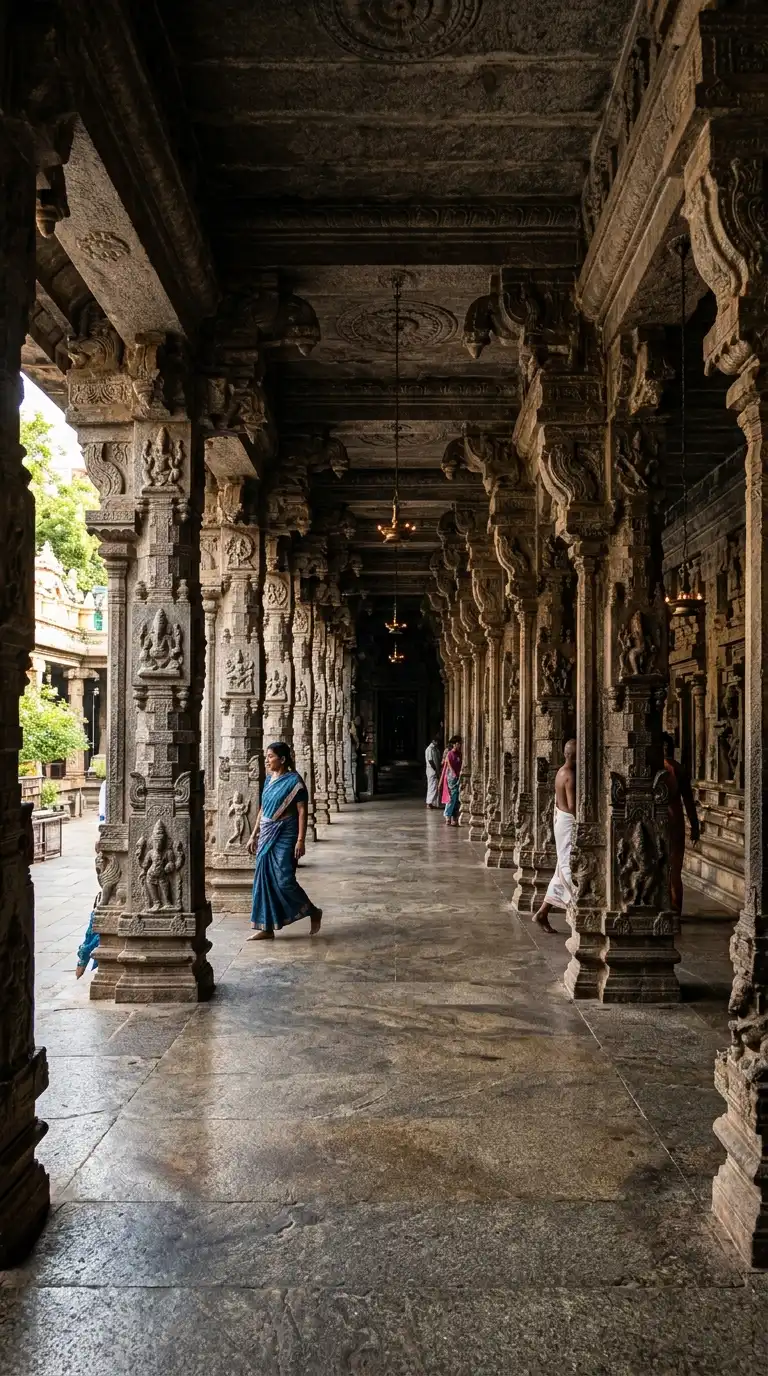 The pillared corridor is a covered walkway lined with pillars. The corridor surrounds the temple or the courtyard. The pillars are carved. The pillared corridor is shaded, carved, and processional.