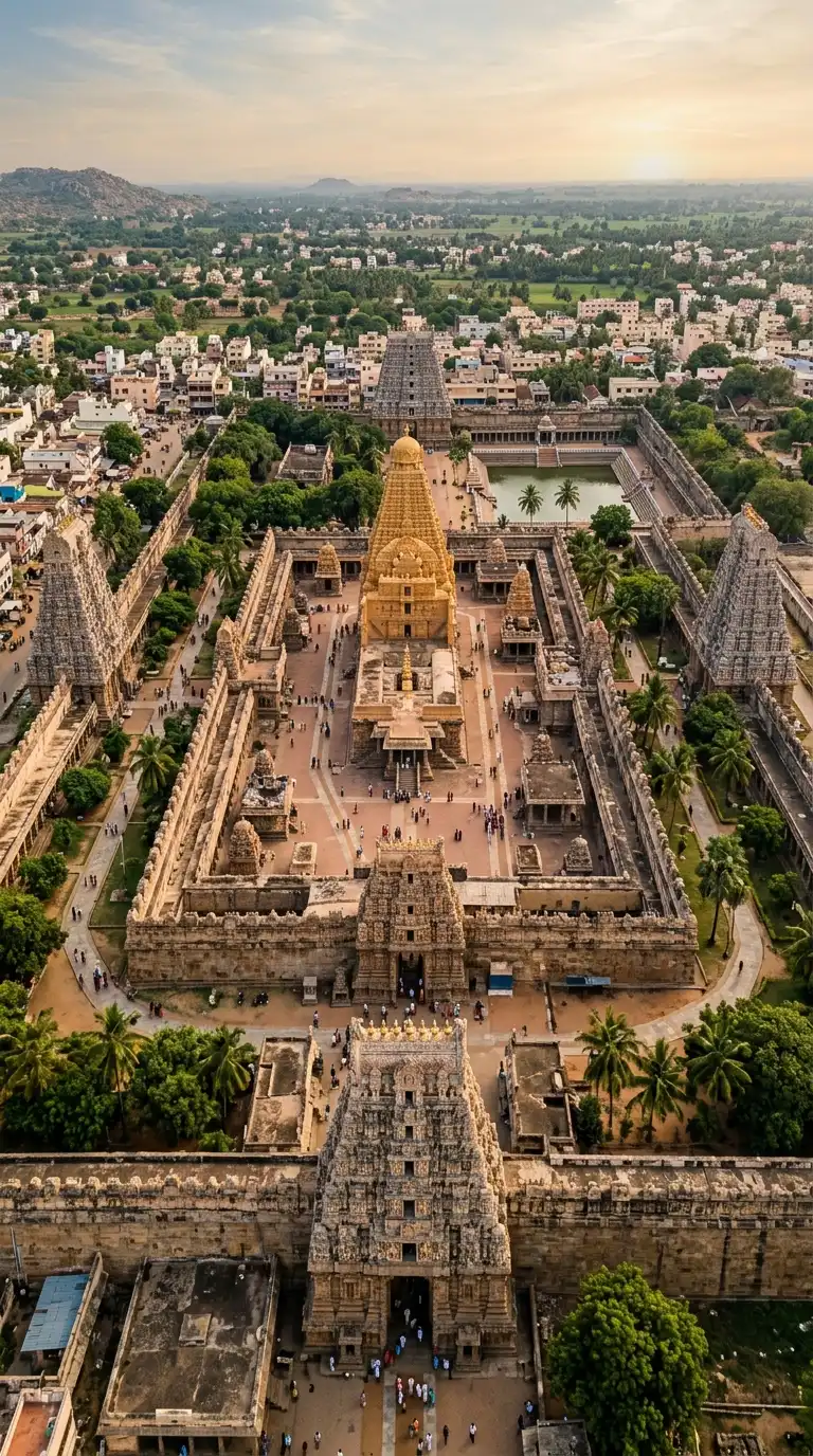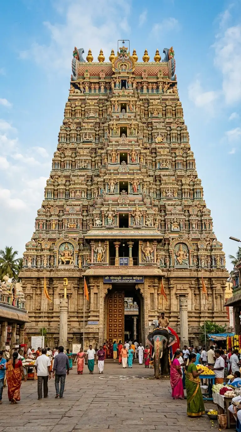 This design is ideal for South Indian temple complexes. The emotional effect is monumental, sculptural, and gateway.