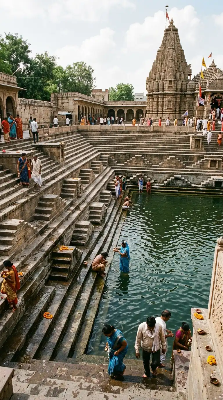 The kunda is a stepped tank or stepwell in a temple complex. The kunda has steps descending to the water. The kunda is used for ritual bathing. The kunda is stepped, watery, and ritual.