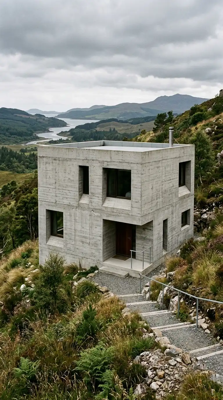 The concrete box is made of smooth, board-formed concrete. The concrete is left raw — no paint, no sealer. The formwork marks are visible and celebrated. The concrete box is heavy, solid, and silent. The only openings are deep-set windows and a recessed entrance.