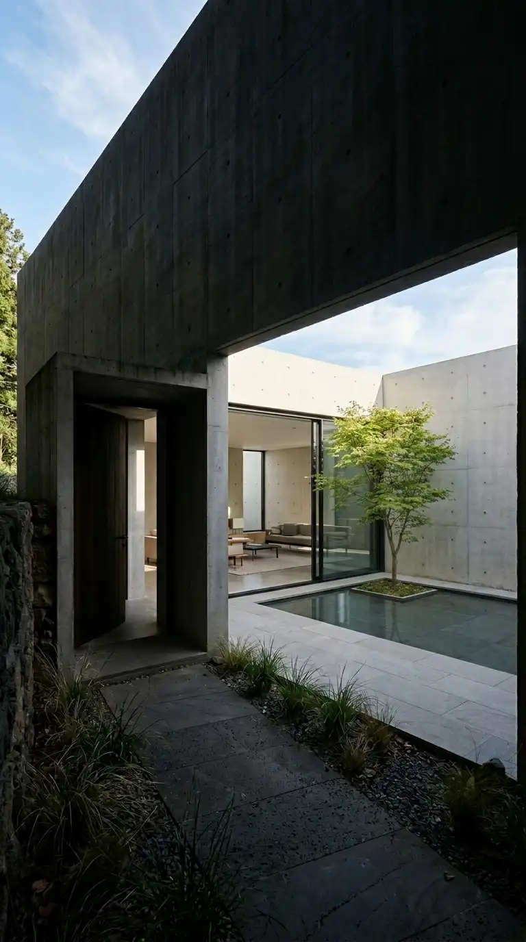The courtyard minimalist wraps a simple box around a central courtyard. The exterior is solid and windowless. The interior opens entirely to the courtyard. The courtyard is the only source of light and air. The courtyard contains a single tree, a pool of water, or a stone garden.