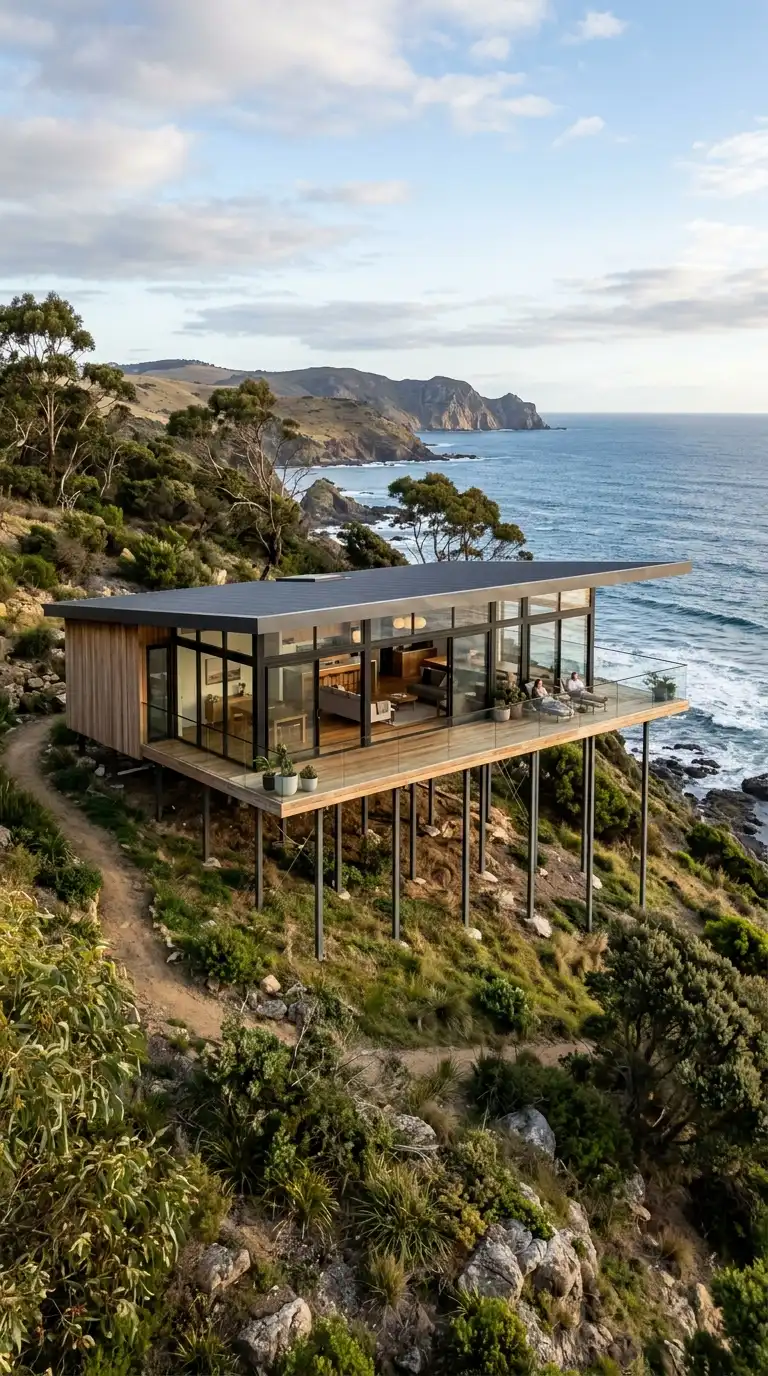 This design is ideal for sloping sites and coastal sites. The emotional effect is horizontal, raised, and landscape-integrated.