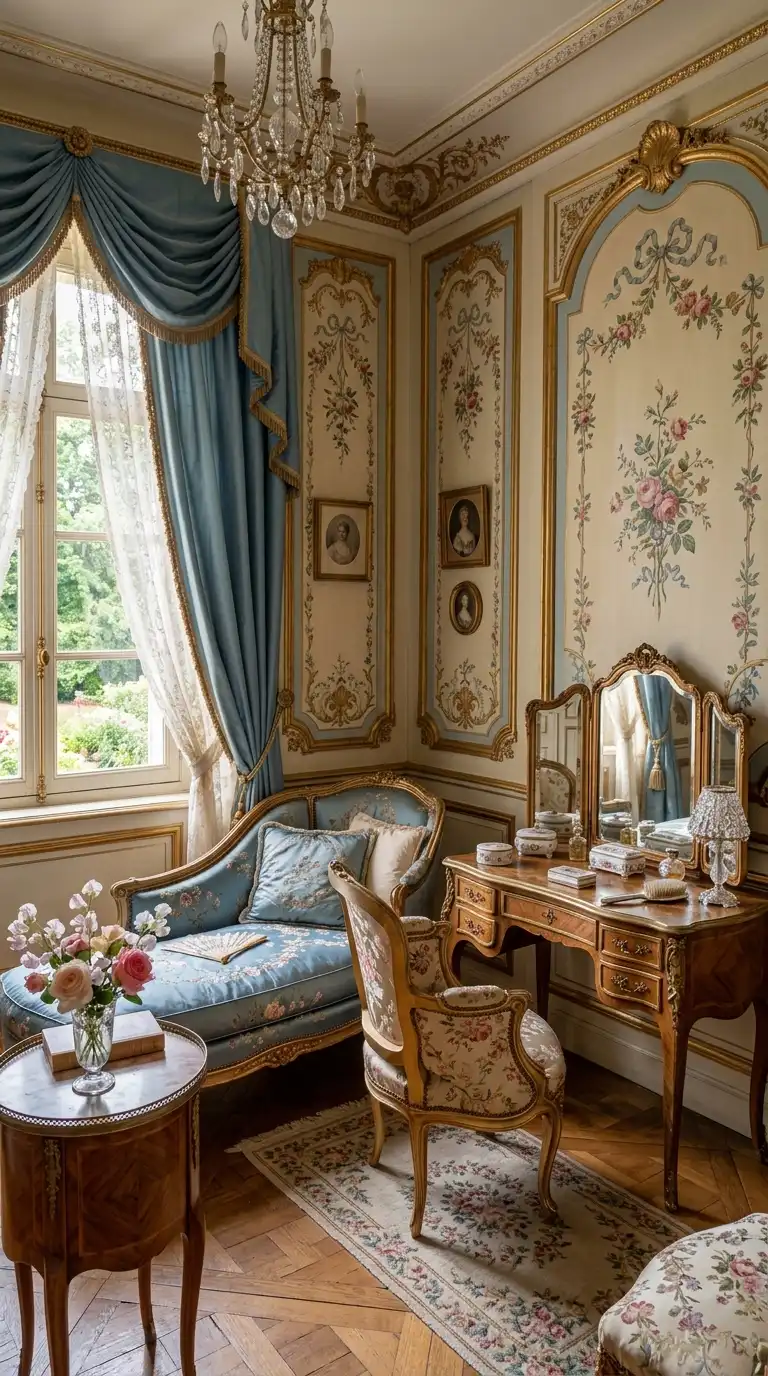 The boudoir is a small, intimate room for a lady. The boudoir is decorated in pastel colours. The walls have painted panels of flowers. The furniture is small and curved. The boudoir is intimate, feminine, and delicate.