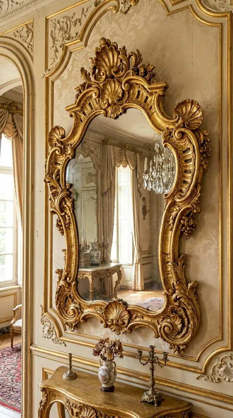 The rocaille mirror is a mirror with an asymmetrical, curving frame. The frame is carved with shells, leaves, and scrolls. The frame is gilded. The rocaille mirror is asymmetrical, curving, and gilded.