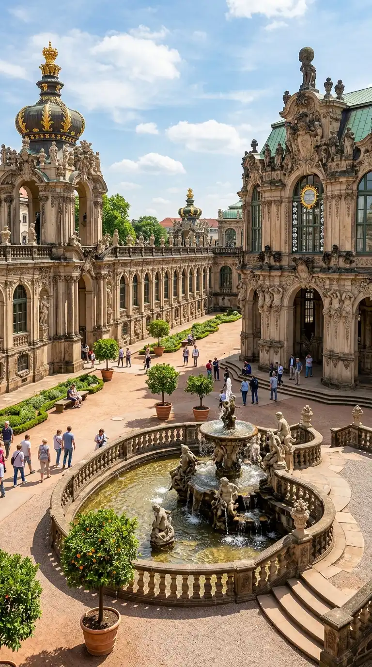 The Dresden Zwinger is a Rococo palace in Dresden. It has pavilions, galleries, and a courtyard. The stone is carved with shells and figures. The Zwinger is sculptural, courtyard-centred, and festive.