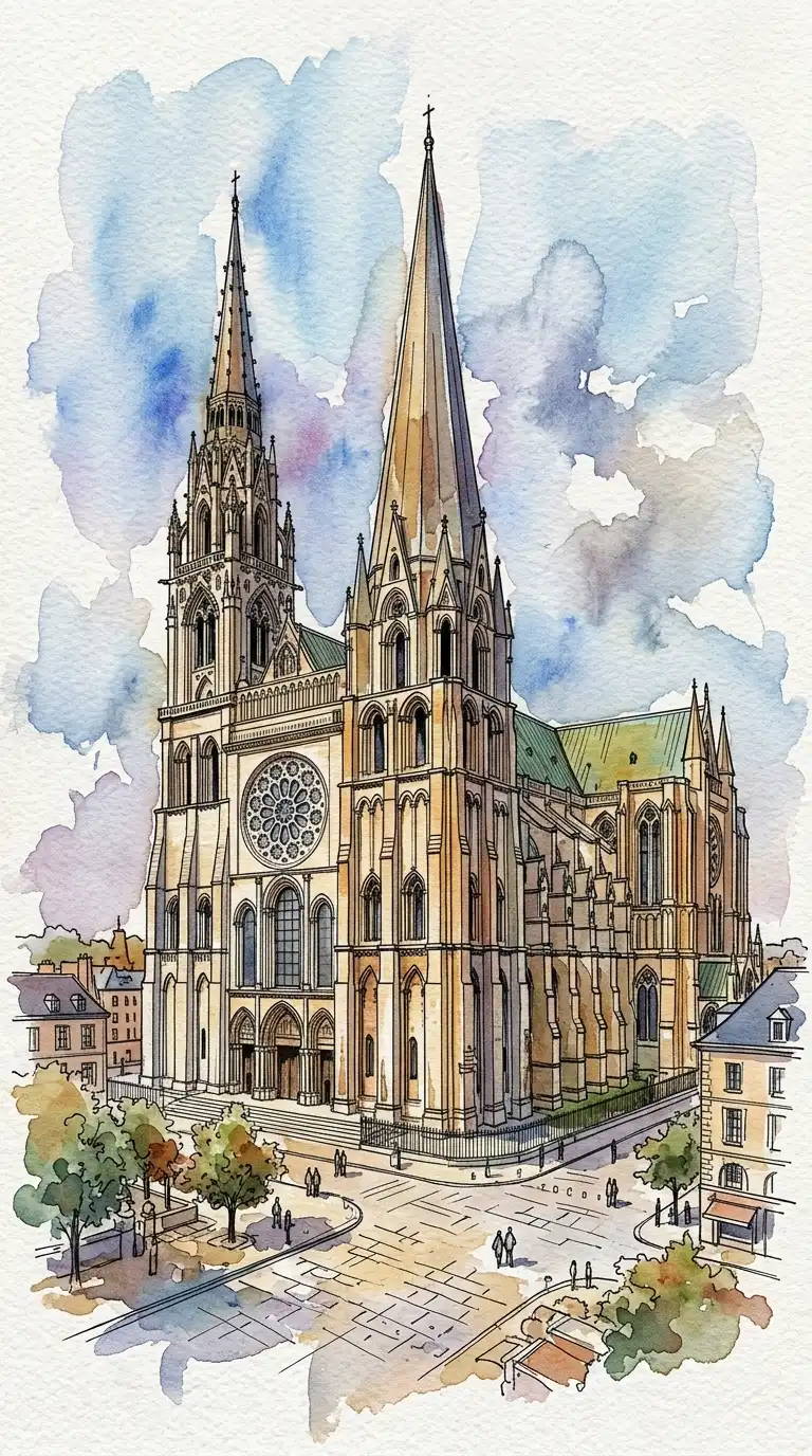 The sky is the backdrop for any architectural watercolor. A dramatic sky — stormy clouds, sunset gradients, or soft haze — sets the mood for the entire image. The building below is almost incidental. The sky is the subject.