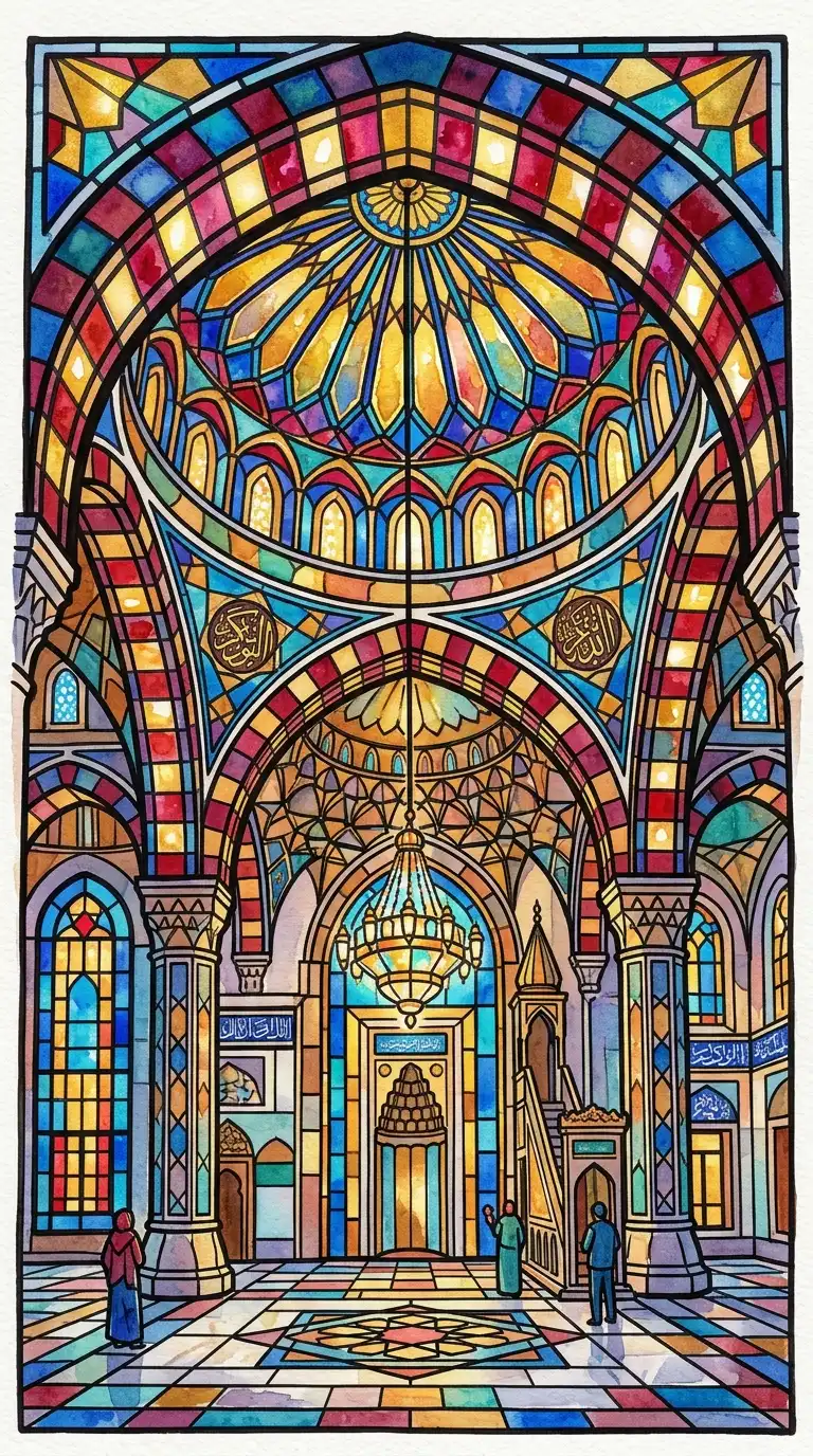 The stained glass effect uses saturated, jewel-like colours applied in discrete patches. The colours do not blend. Each patch is separated by white paper or dark lines. The effect is like a stained glass window — luminous and segmented.