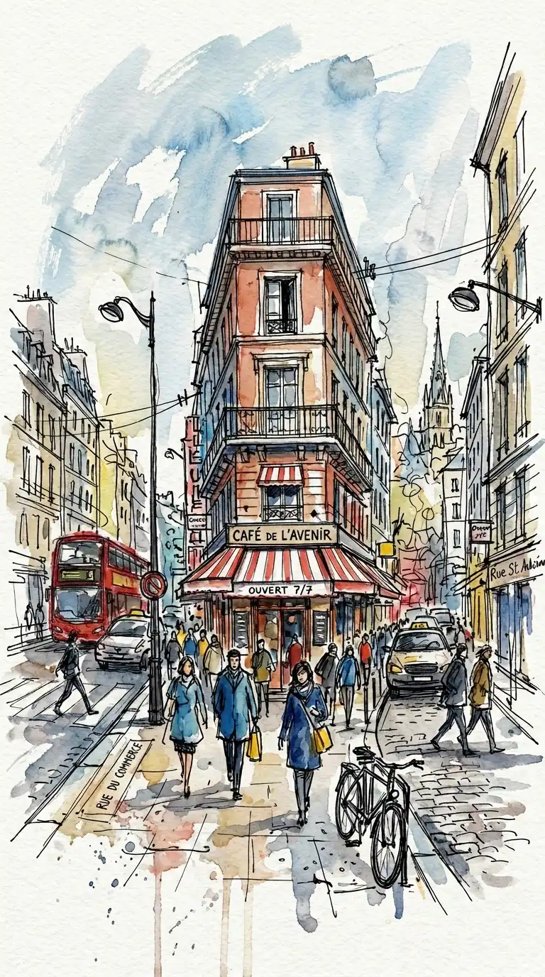 The urban sketch is quick, loose, and on location. The goal is not accuracy but impression. The sketch captures the feeling of a place in a few minutes. Lines are energetic. Washes are fast.