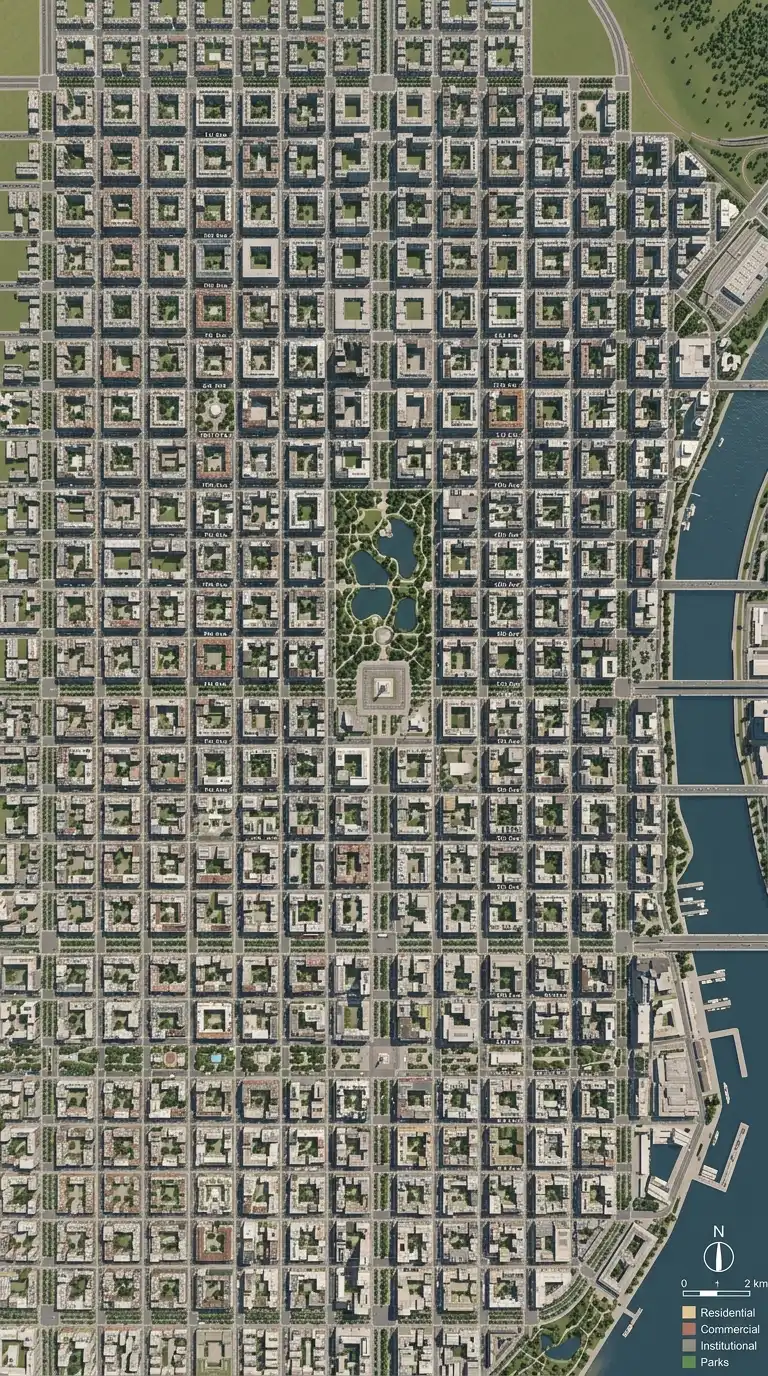 The grid masterplan organises streets in a regular orthogonal grid. The grid is rational, efficient, and expandable. Blocks are uniform. The grid can be oriented to the sun, the wind, or the view. The grid masterplan is the oldest and most common masterplan type.