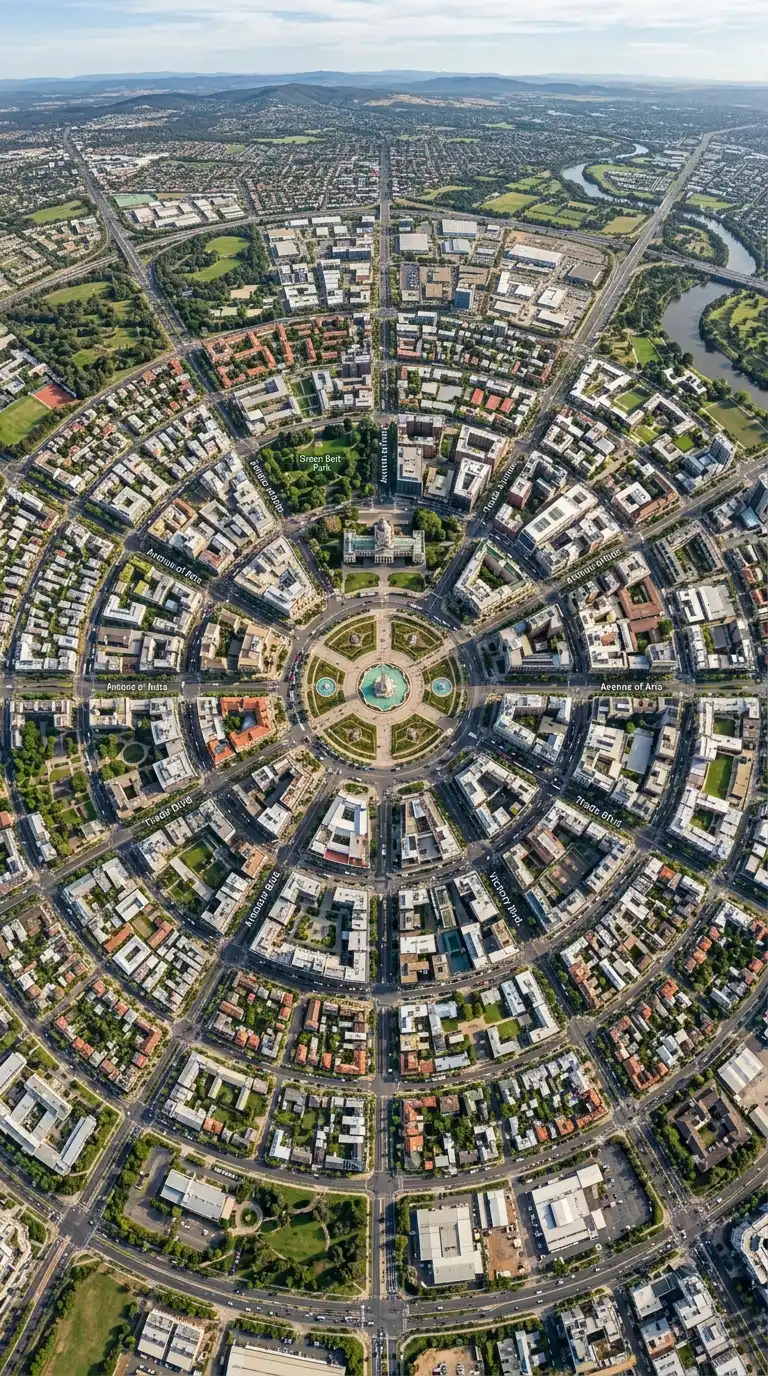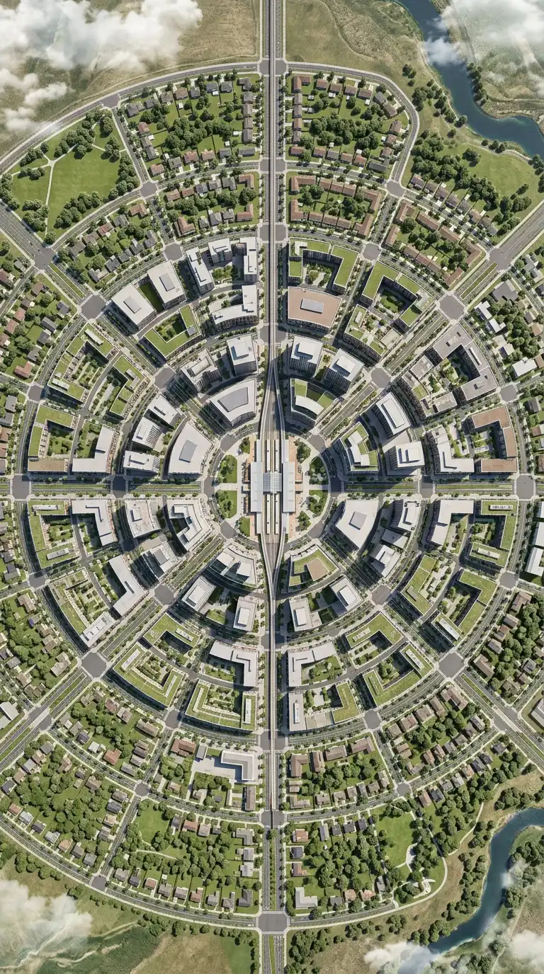 The radial masterplan has streets radiating from a central point like spokes from a wheel. The centre is a plaza, park, or landmark. Concentric rings connect the spokes. The radial masterplan is dramatic, hierarchical, and ceremonial.