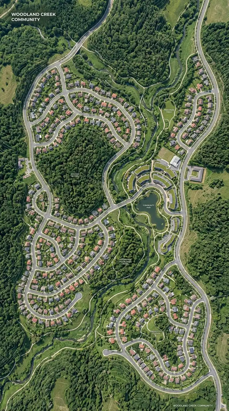 The organic masterplan follows the natural forms of the land. Streets curve, blocks are irregular, and open space is preserved. The plan looks like it grew from the site, not imposed upon it. The organic masterplan is ideal for hilly or wooded sites.