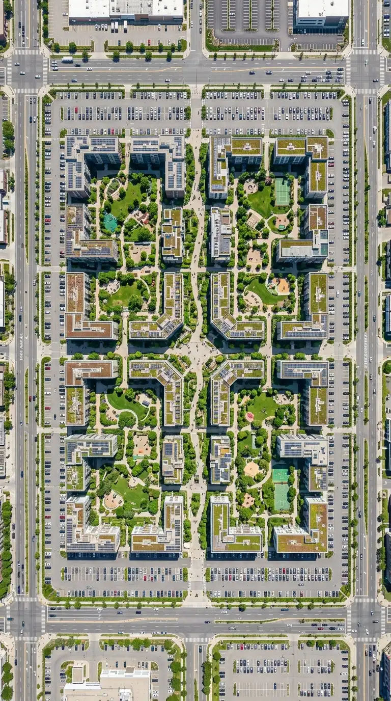 This design is ideal for dense urban development and campus plans. The emotional effect is pedestrian-friendly, green, and modern.
