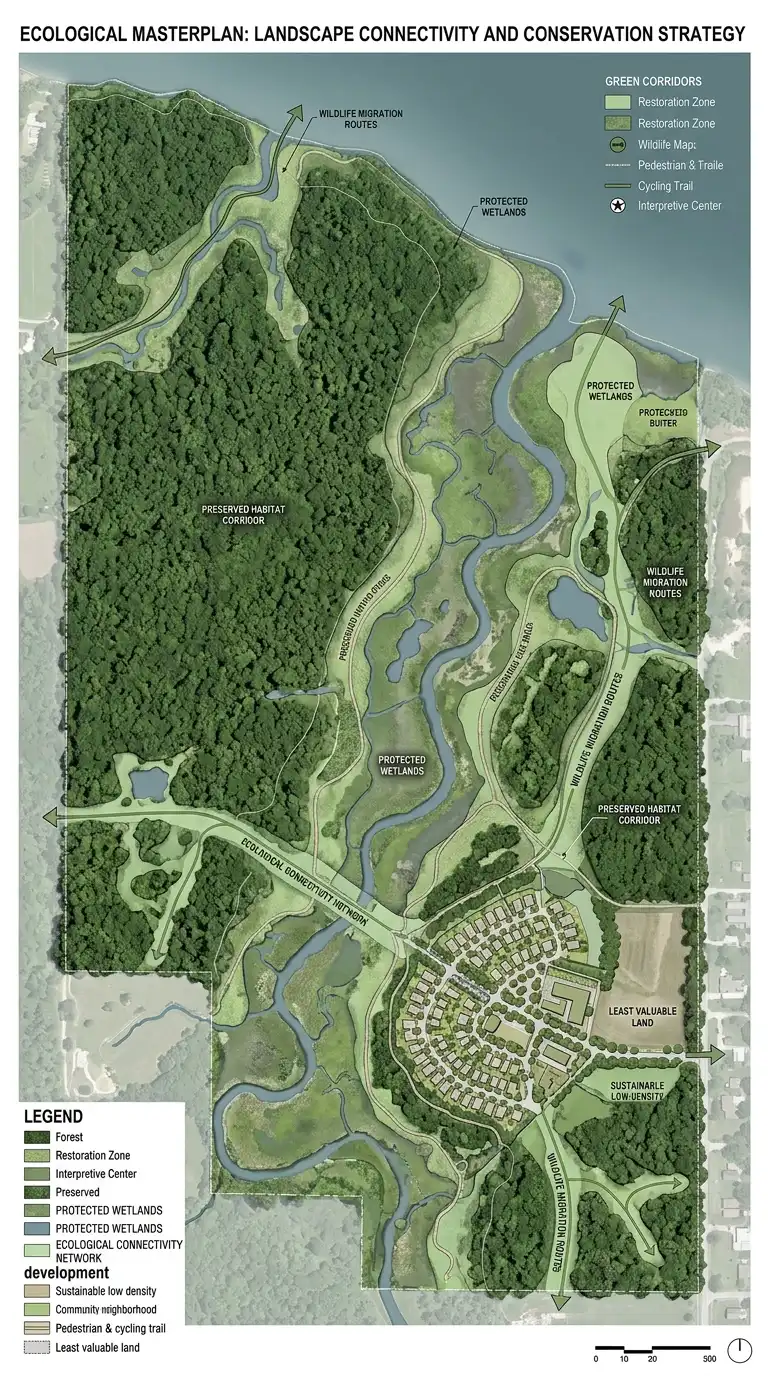 The ecological masterplan prioritises ecology over development. Open space is preserved first. Development is placed on the least ecologically valuable land. Green corridors connect natural areas. The ecological masterplan is sustainable and resilient.