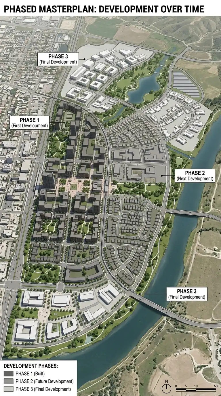 The phased masterplan shows how the site will be developed over time. Phase 1 is the first development. Phase 2 is the next. Phase 3 is the final. The phased masterplan is realistic and buildable. It allows the plan to grow with demand.