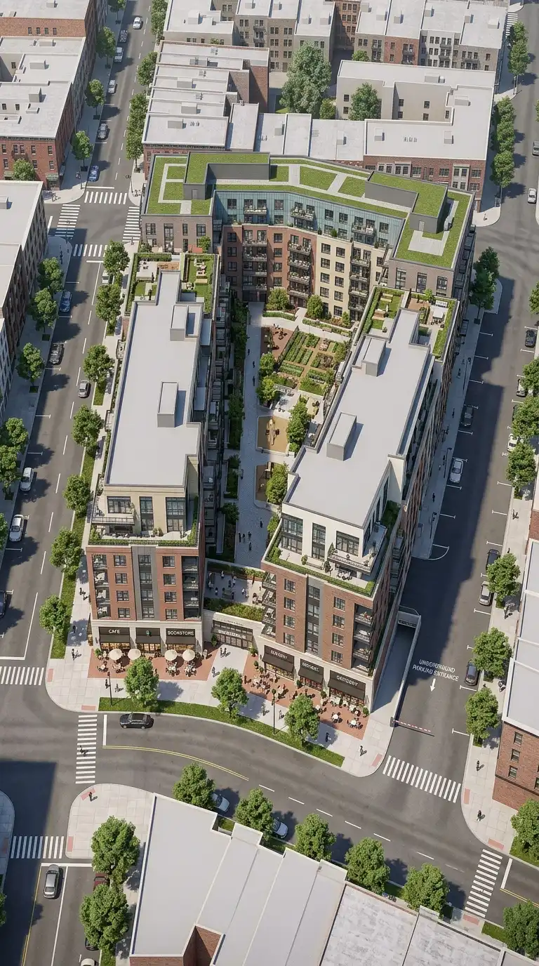 This design is ideal for suburban infill and brownfield redevelopment. The emotional effect is transit-focused, walkable, and dense.