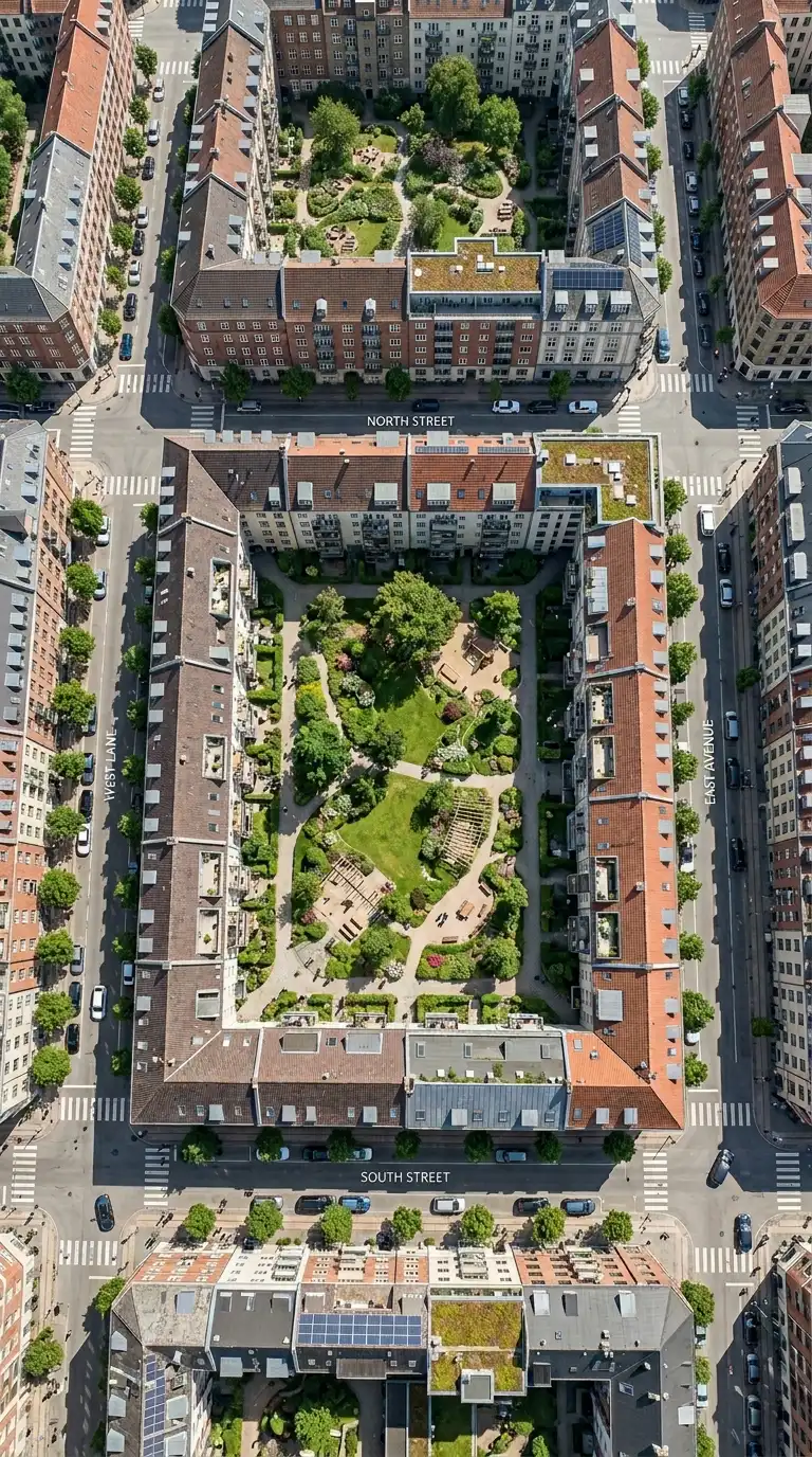 The perimeter block masterplan places buildings around the perimeter of the block, with a common courtyard in the centre. The street edge is solid and urban. The interior is private and green. The perimeter block masterplan is common in European cities.