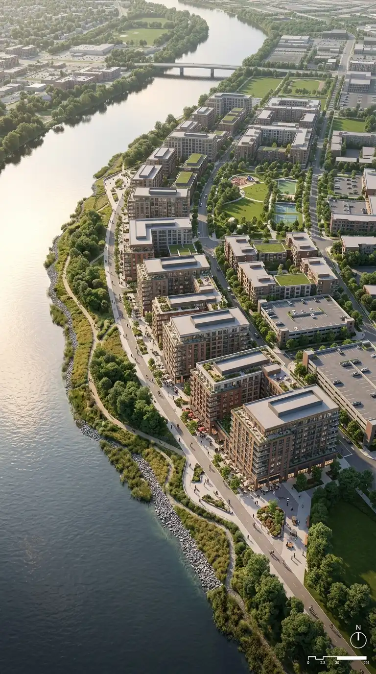 The waterfront masterplan is organised around a body of water — a river, lake, or ocean. Buildings face the water. Public access to the water is provided. The waterfront masterplan protects the shoreline from erosion and development.