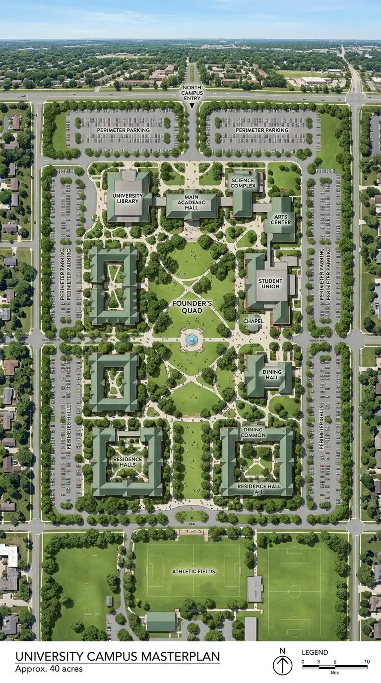The campus masterplan organises buildings around quadrangles, courtyards, and malls. The plan is pedestrian-only. Parking is at the perimeter. The campus masterplan is ideal for universities, hospitals, and corporate campuses.