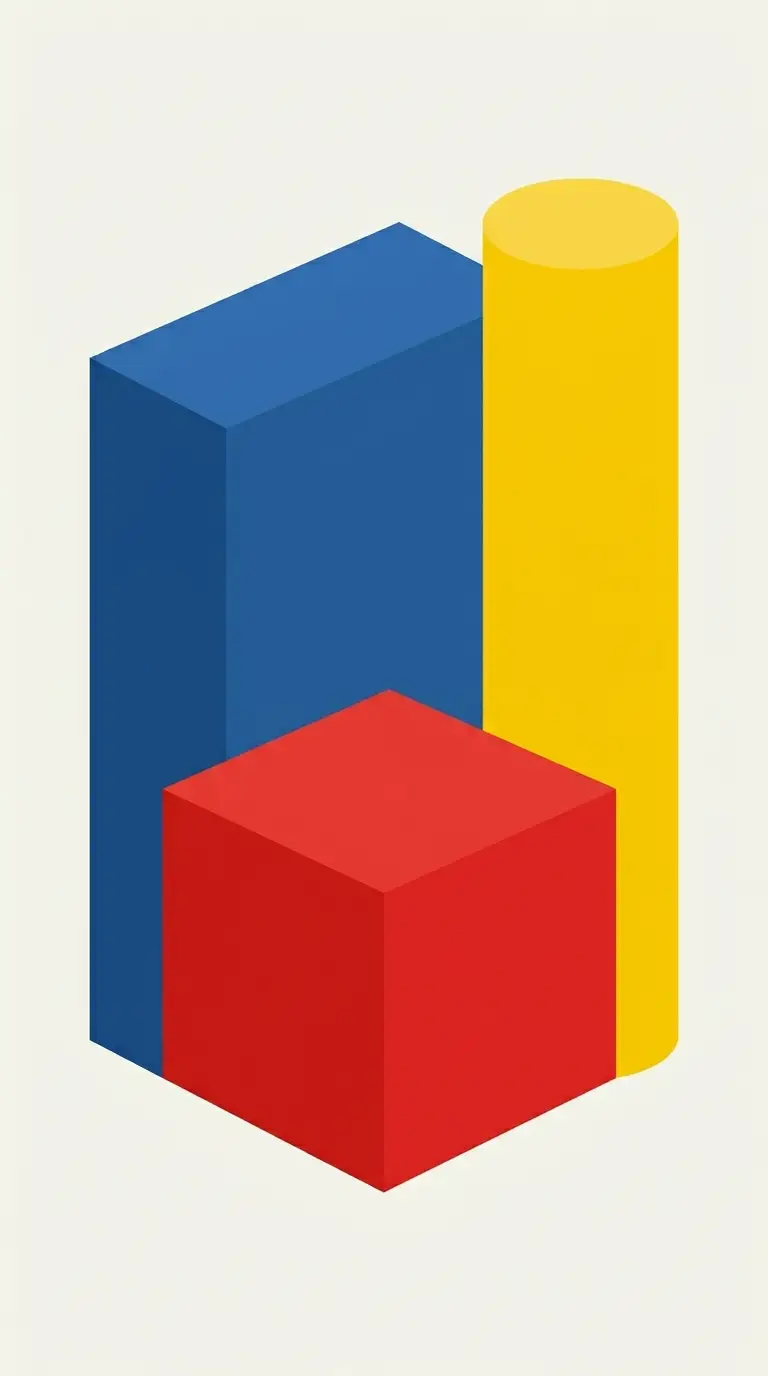The colour block building wallpaper reduces a building to its essential masses in bold, flat colours. A red block for one volume, a blue block for another, a yellow block for a third. No details, no gradients, no shadows.