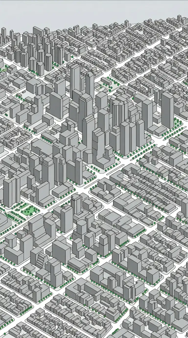 - Simplify buildings to simple masses — no windows, no details.