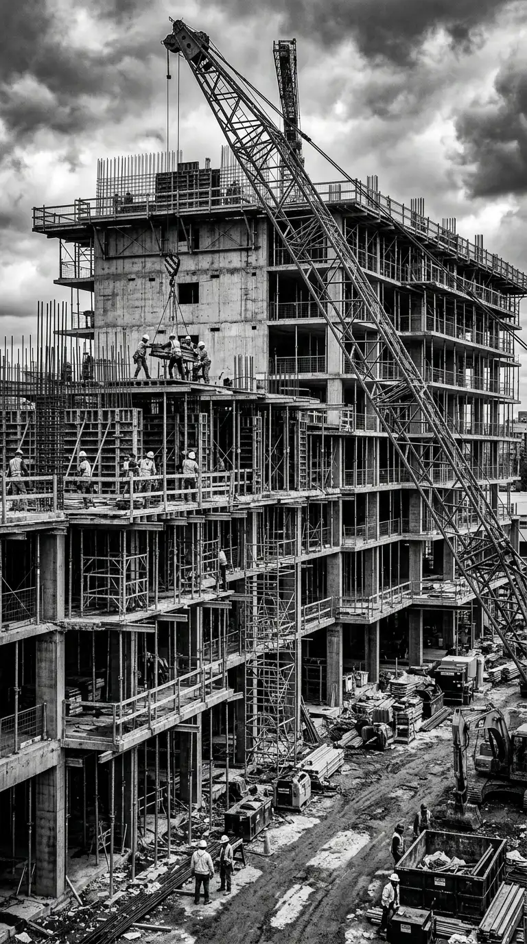 The construction photograph wallpaper captures a building under construction. Cranes, scaffolding, exposed rebar, and concrete forms. The image is raw, industrial, and honest.