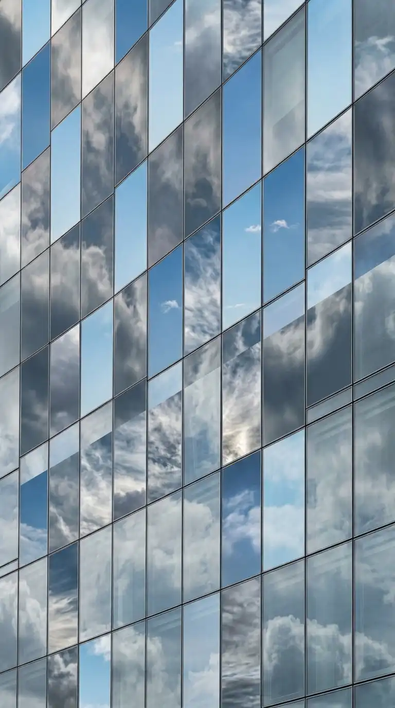 The glass reflection wallpaper captures the reflection of clouds, trees, or neighbouring buildings in a glass curtain wall. The building itself is almost invisible — only the reflection is visible. The image is abstract, layered, and luminous.