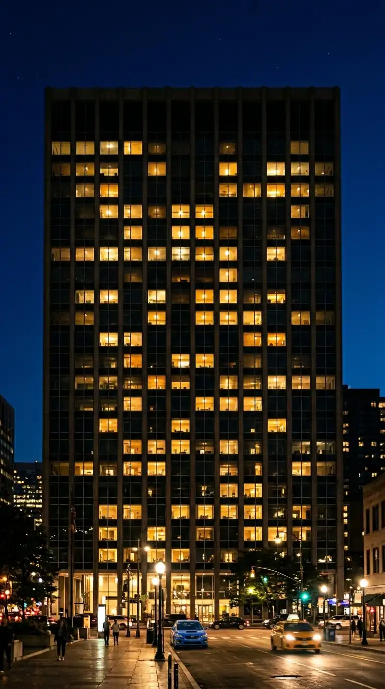 The night facade wallpaper captures a building at night, with windows lit from within. The facade is dark, but the windows glow in warm yellows and oranges. The pattern of lit windows becomes an abstract grid.