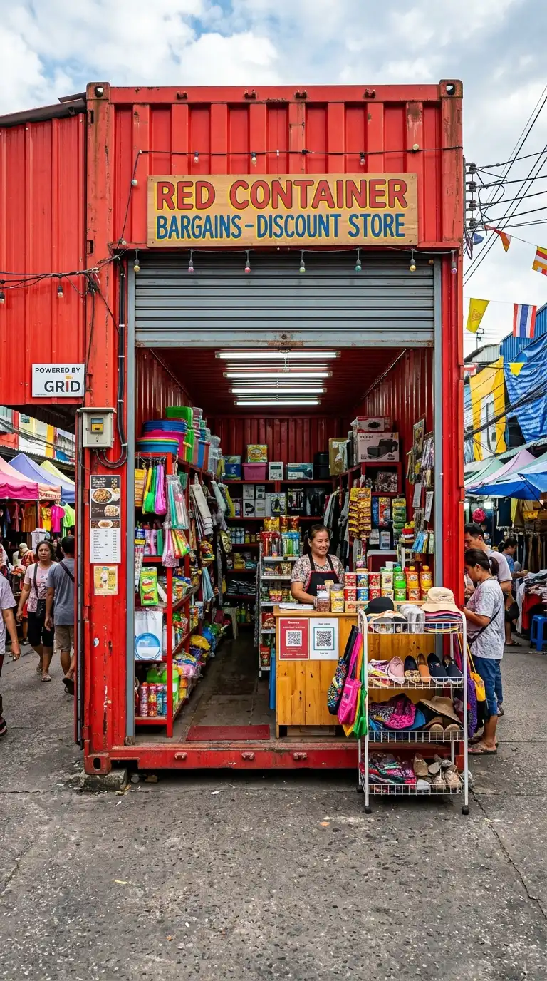 The container shop is a single container used as a retail space. The container has a large opening on one side — a roll-up door or glass wall. The container shop is cheap, fast, and eye-catching.