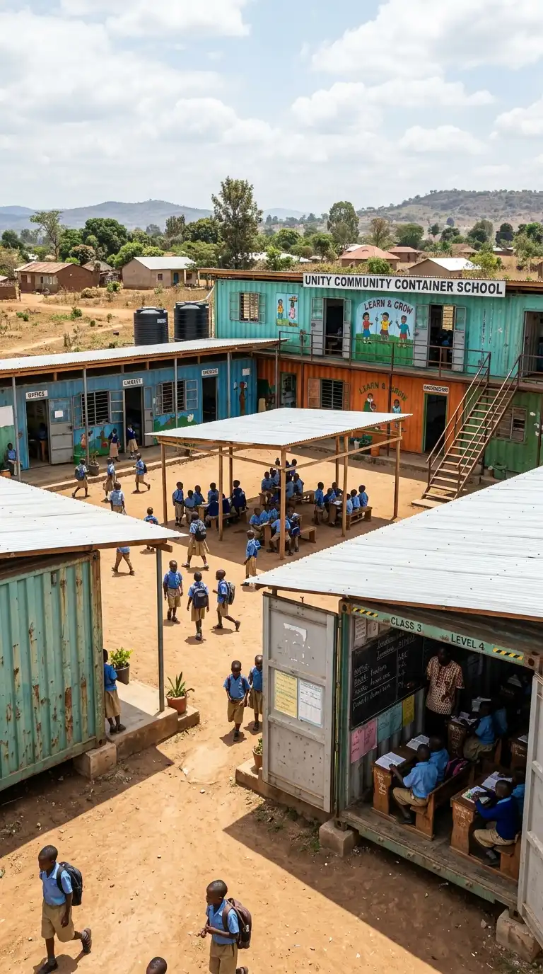 The container school is a cluster of containers used as a school. The containers are arranged around a courtyard. Some containers are classrooms. Some are offices. Some are toilets. The container school is cheap, fast, and modular.