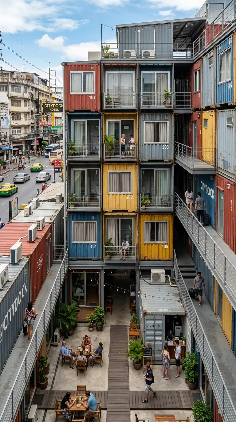 The container hotel is a cluster of containers used as hotel rooms. Each container is a guest room. The containers are stacked and arranged around a courtyard or corridor. The container hotel is cheap, fast, and modular.