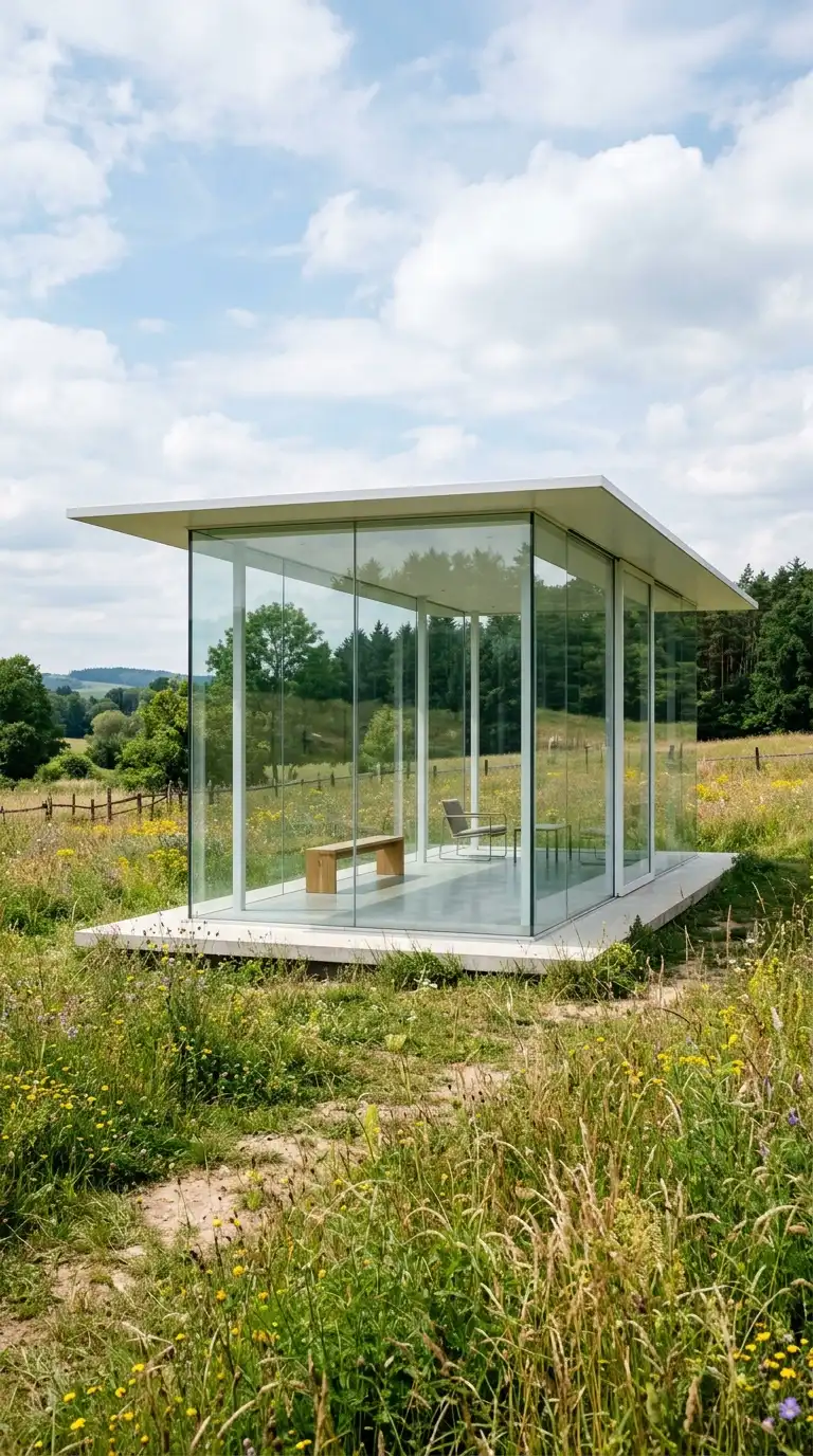 The glass pavilion is a transparent, minimalist building. The walls are floor-to-ceiling glass. The roof is a thin white slab. The structure is minimal — thin columns, flush details. The glass pavilion disappears. The landscape becomes the room.
