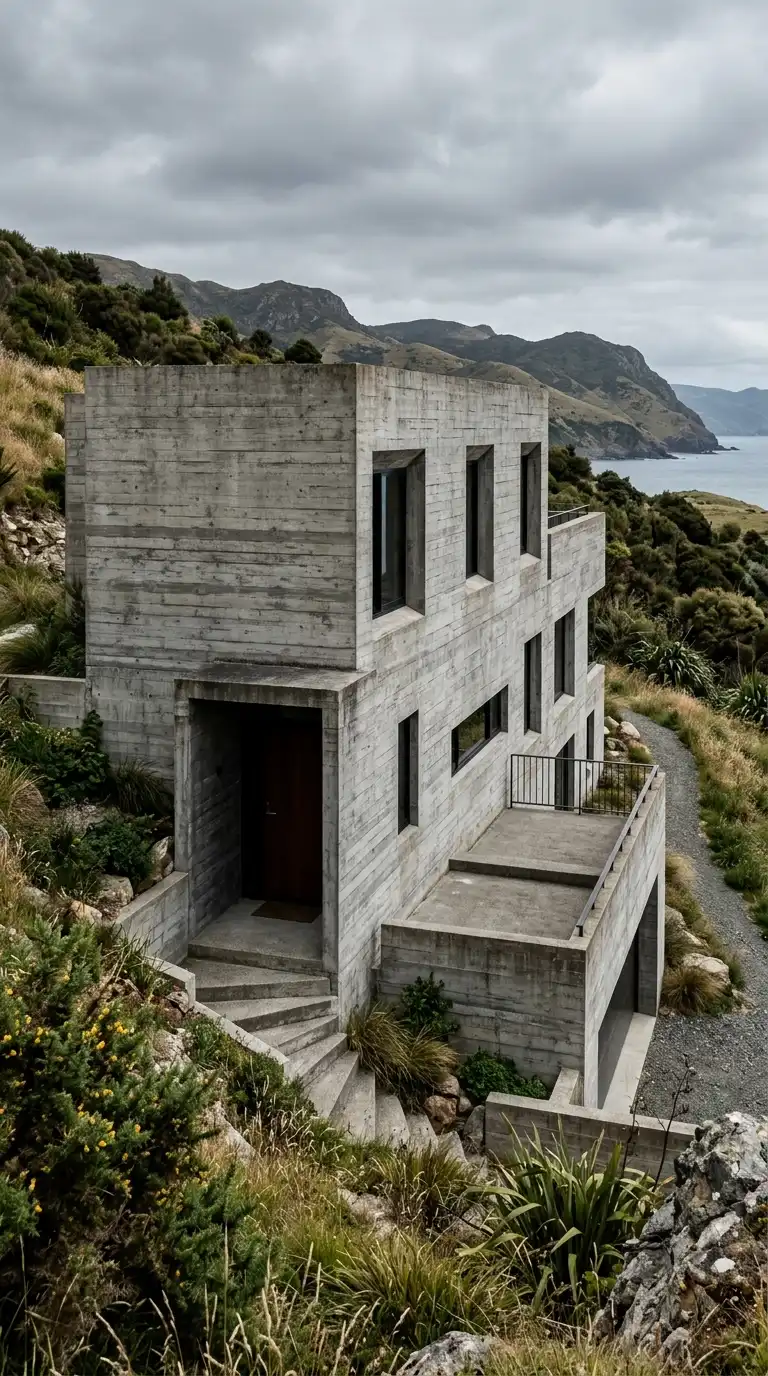 The concrete house is made of board-formed concrete. The concrete is left raw — no paint, no cladding. The formwork marks are visible. The windows are deep-set. The entrance is recessed. The concrete house is solid, silent, and heavy.