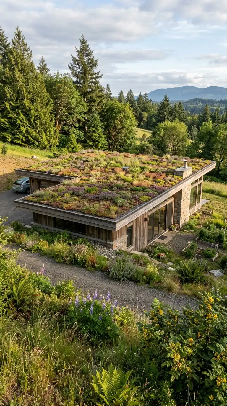 The green roof house has a roof planted with vegetation. The roof is visible from above. The house is integrated with the landscape. The green roof insulates, absorbs rainwater, and provides habitat. The green roof house is green, ecological, and landscape-integrated.