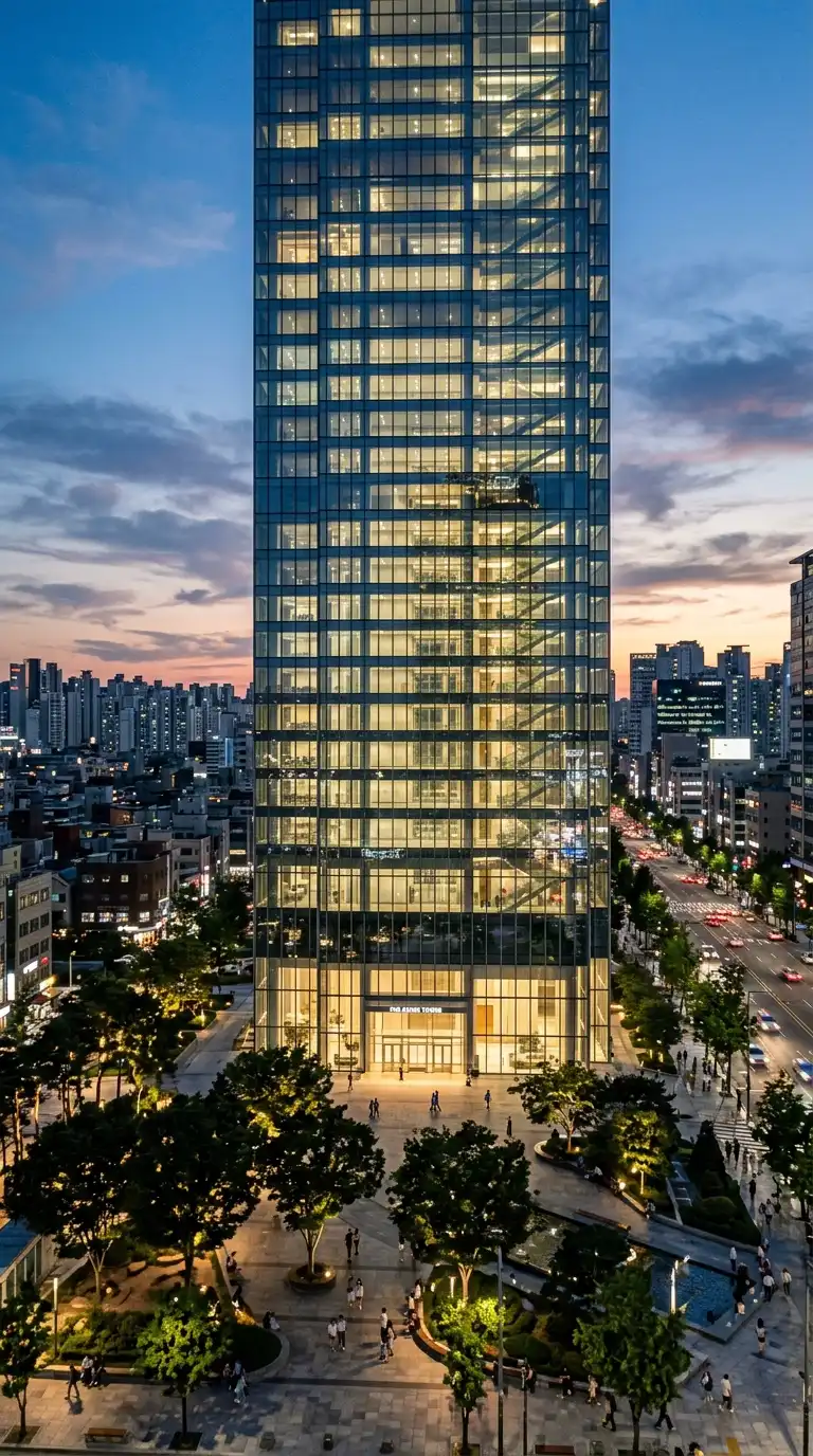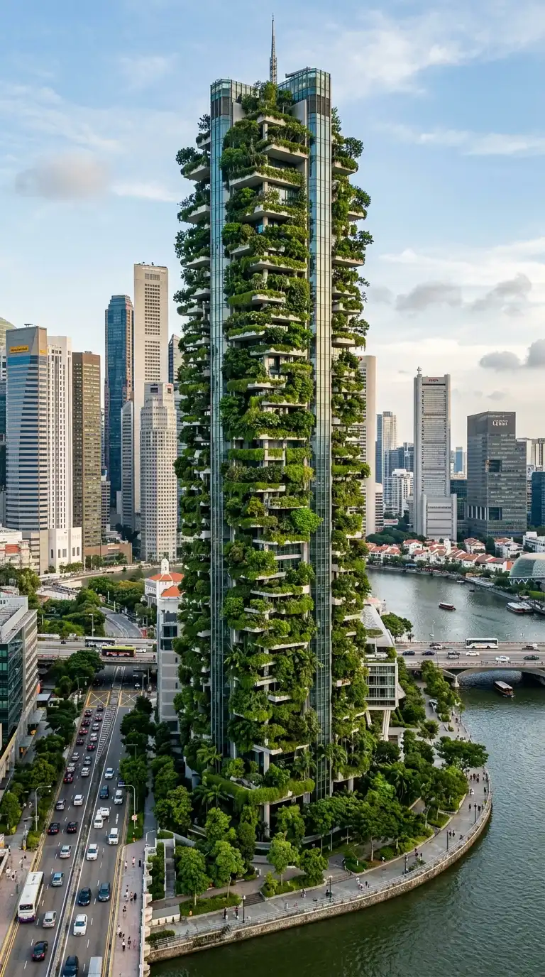 This design is ideal for office buildings and residential towers in dense cities. The emotional effect is green, vertical, and ecological.