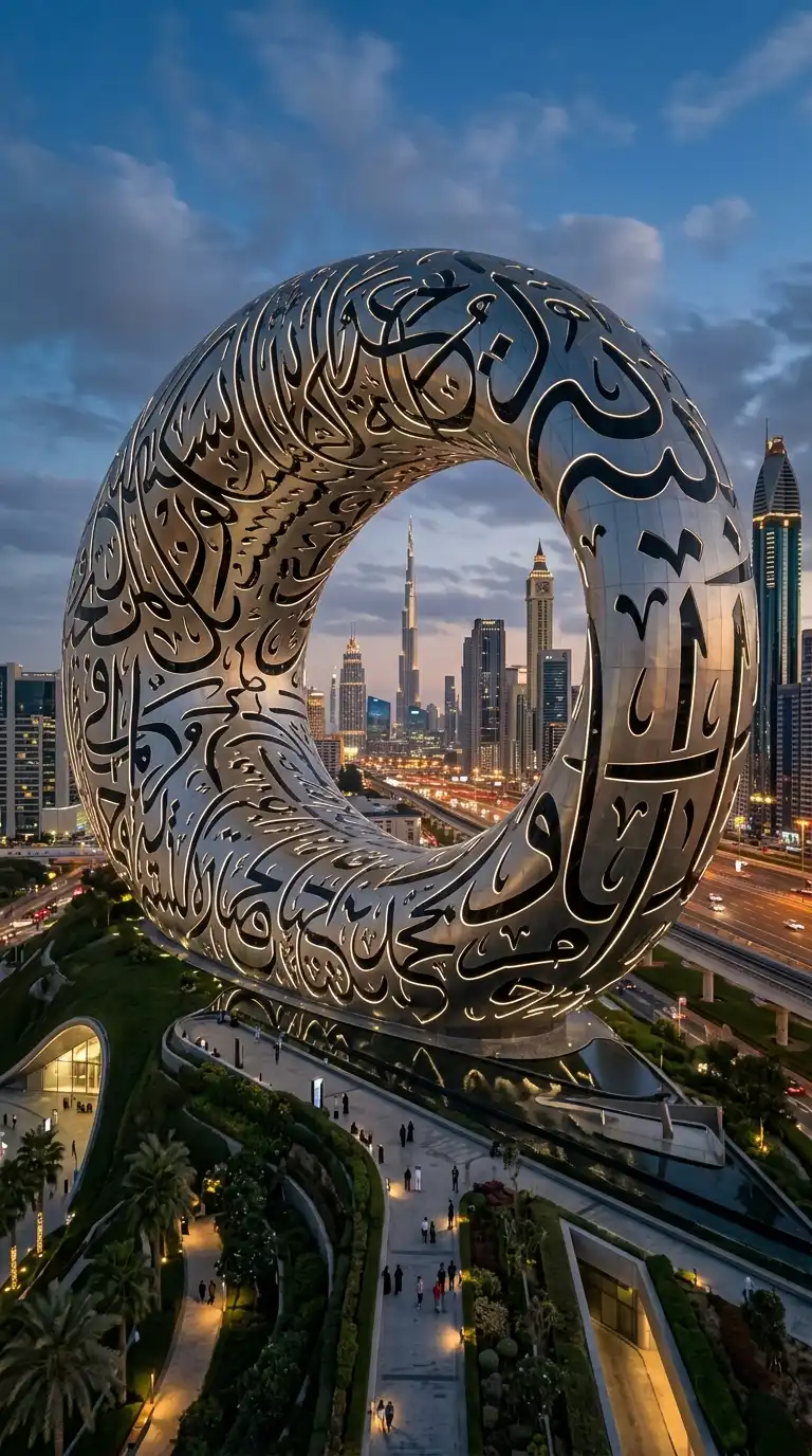 The museum of the future is a building shaped like a torus (a donut) with a void in the centre. The facade is covered in Arabic calligraphy. The museum is futuristic, calligraphic, and toroidal.