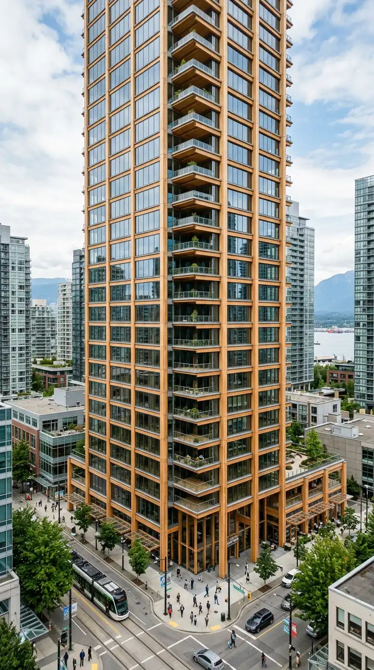 The timber tower is a tall building made of mass timber (CLT, glulam). The structure is exposed. The timber is warm and natural. The timber tower is sustainable, warm, and vertical.