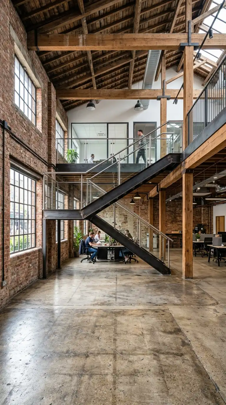 This design is ideal for urban sites with historic industrial buildings. The emotional effect is industrial, modern, and layered.