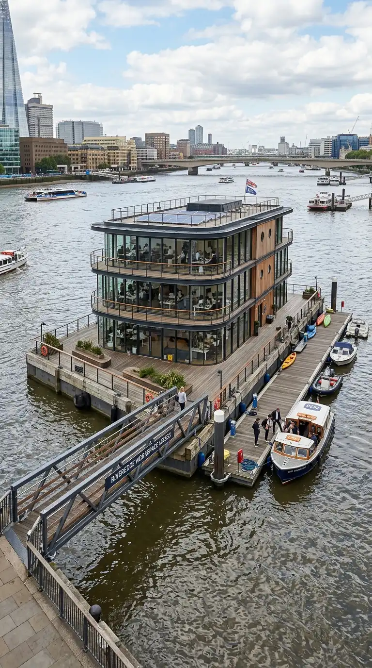 The floating office is an office building on water. The building is a floating platform. The office is accessible by land and by boat. The floating office is nautical, floating, and waterfront.