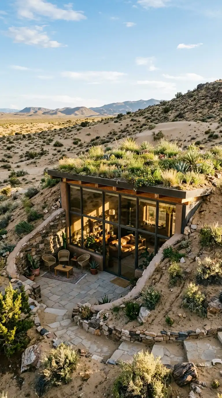 This design is ideal for houses in natural settings. The emotional effect is green, ecological, and landscape-integrated.