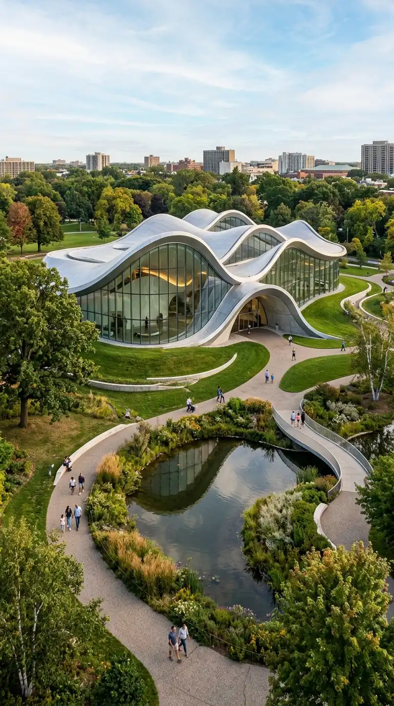 The undulating museum is a building with a curving, undulating roof. The roof is a single continuous surface. The museum is sculptural, fluid, and organic.