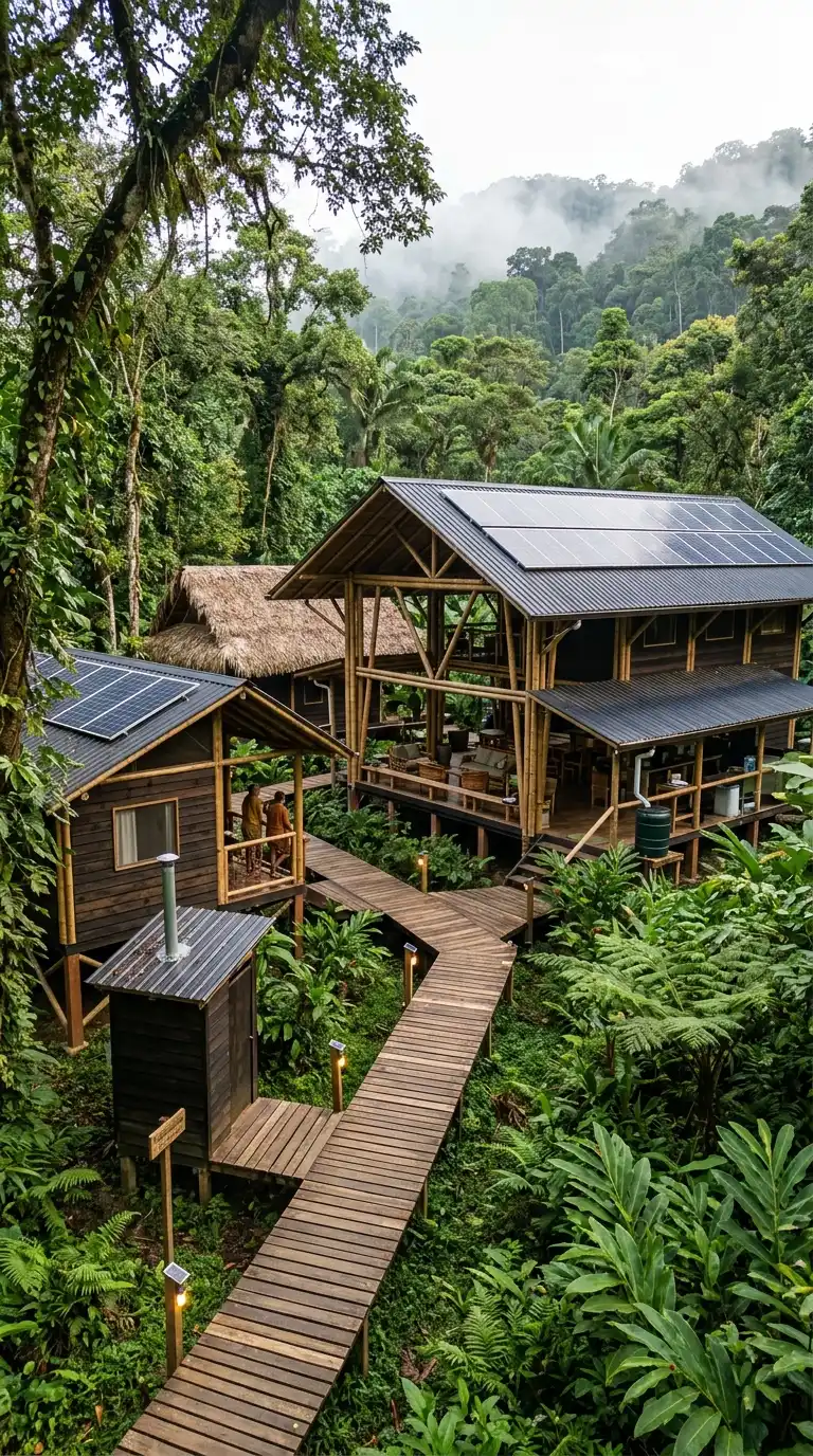 The eco-lodge is a hotel built with sustainable materials and powered by renewable energy. The building is off-grid or low-impact. The eco-lodge is small, remote, and nature-integrated. The eco-lodge is sustainable, responsible, and nature-connected.
