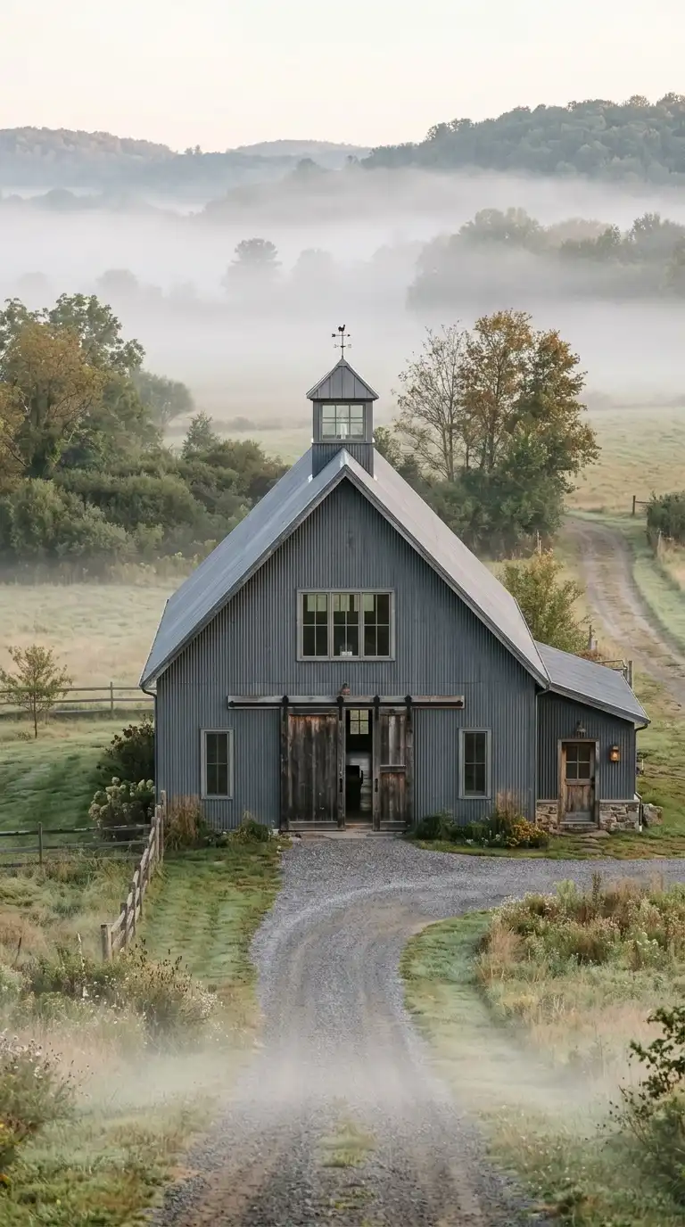 The barn house adapts agricultural forms for residential use. The roof is the dominant element: a steep gable, often with a cupola or monitor. The plan is simple and open — one large volume with few interior walls. Materials are honest: wood, corrugated metal, concrete.