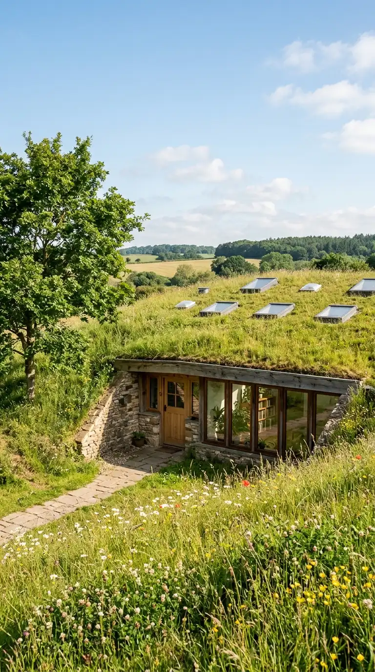 The underground house disappears into the landscape. The roof is earth. The walls are earth or concrete. The only visible elements are the entrance, windows, and a few skylights. The site remains mostly natural.